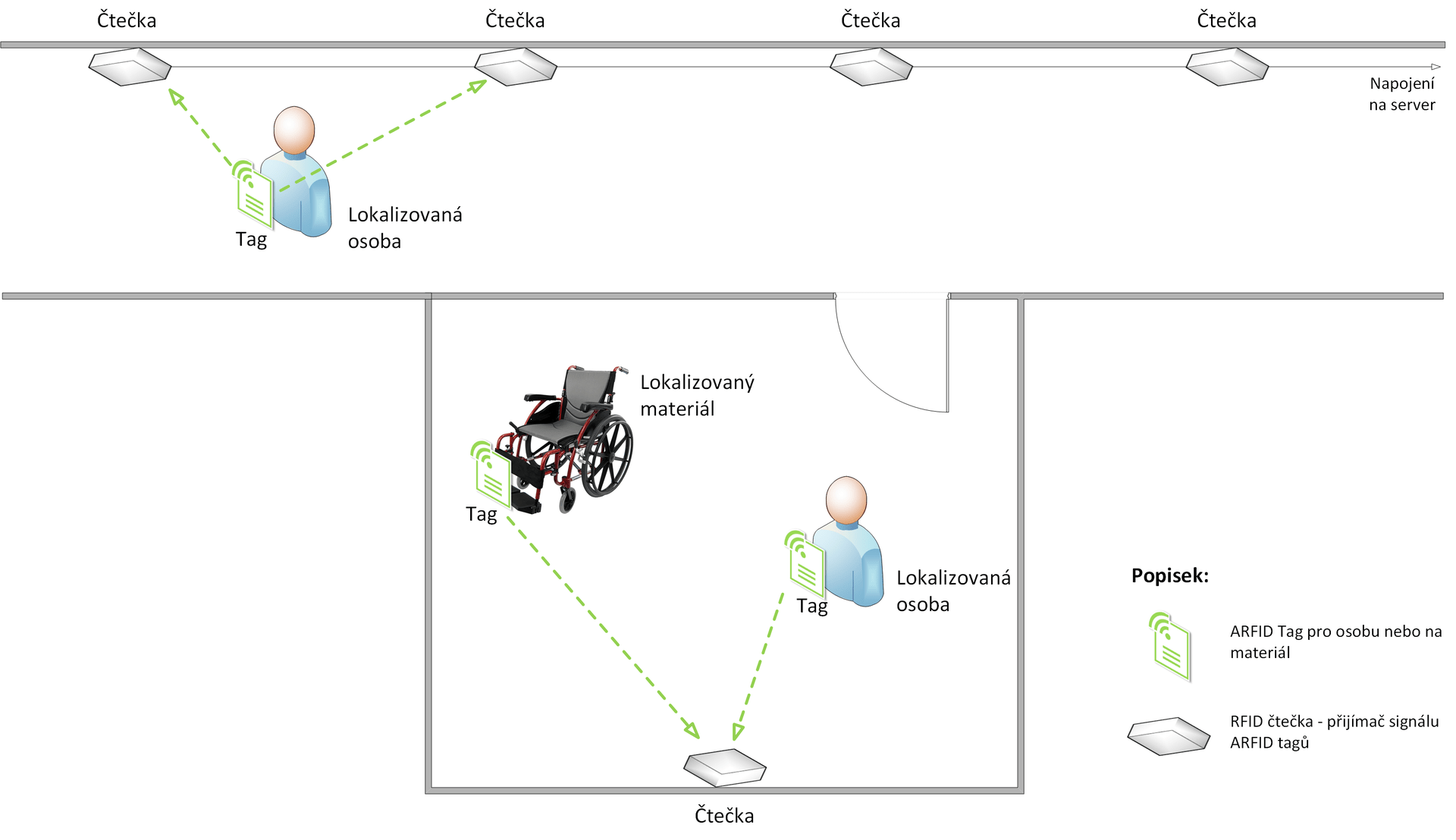 - Podél monitorovaných prostor jsou rozmístěny RFID čtečky.